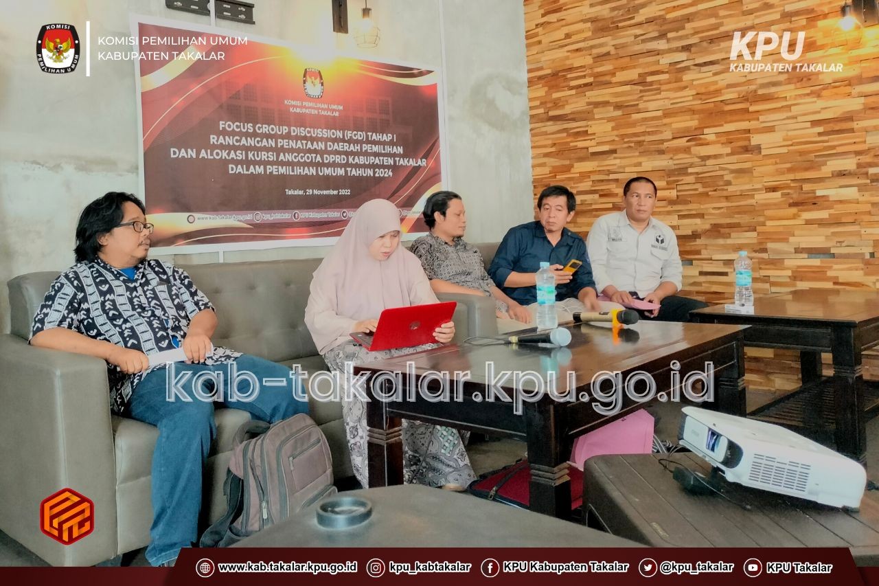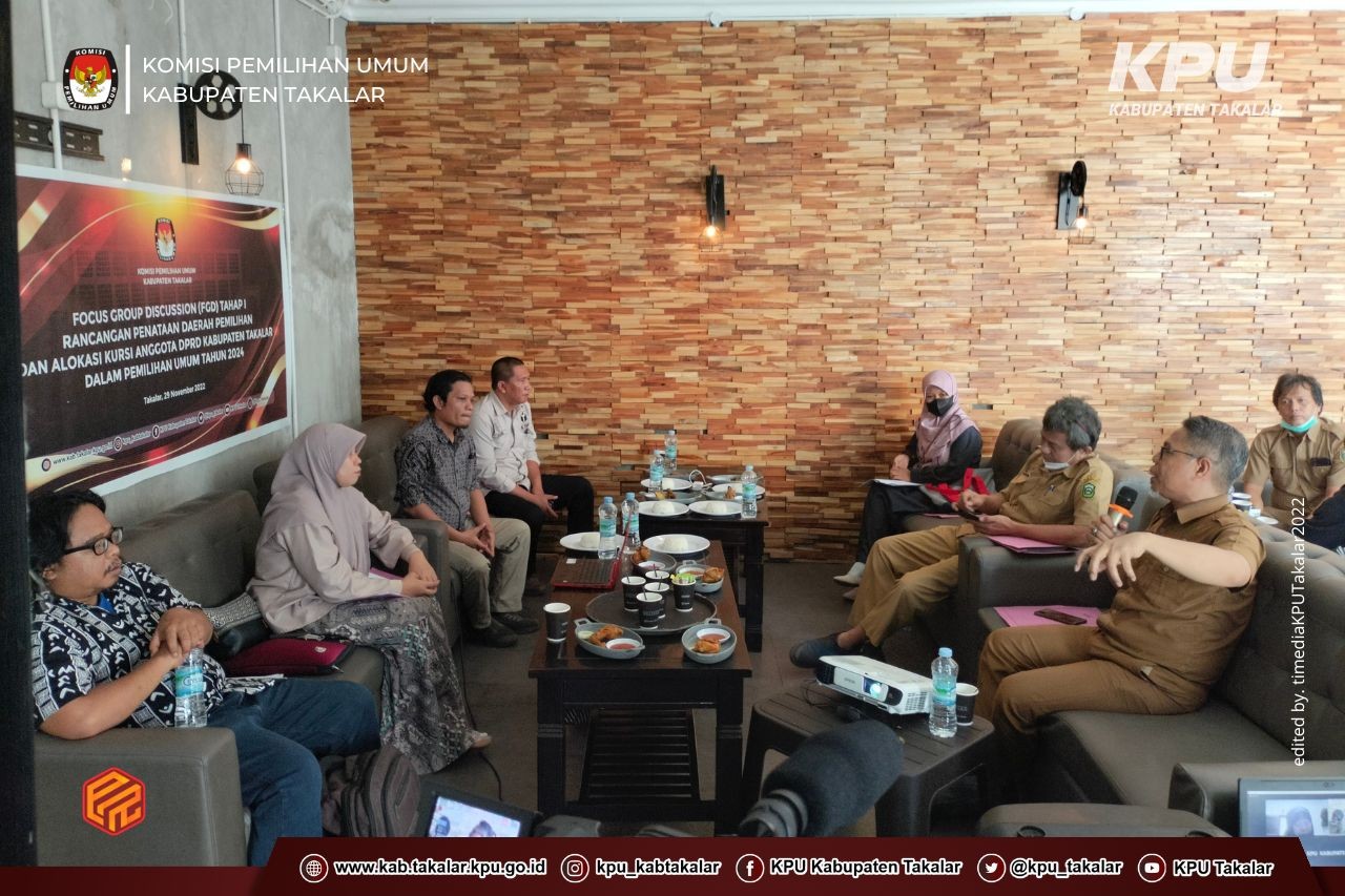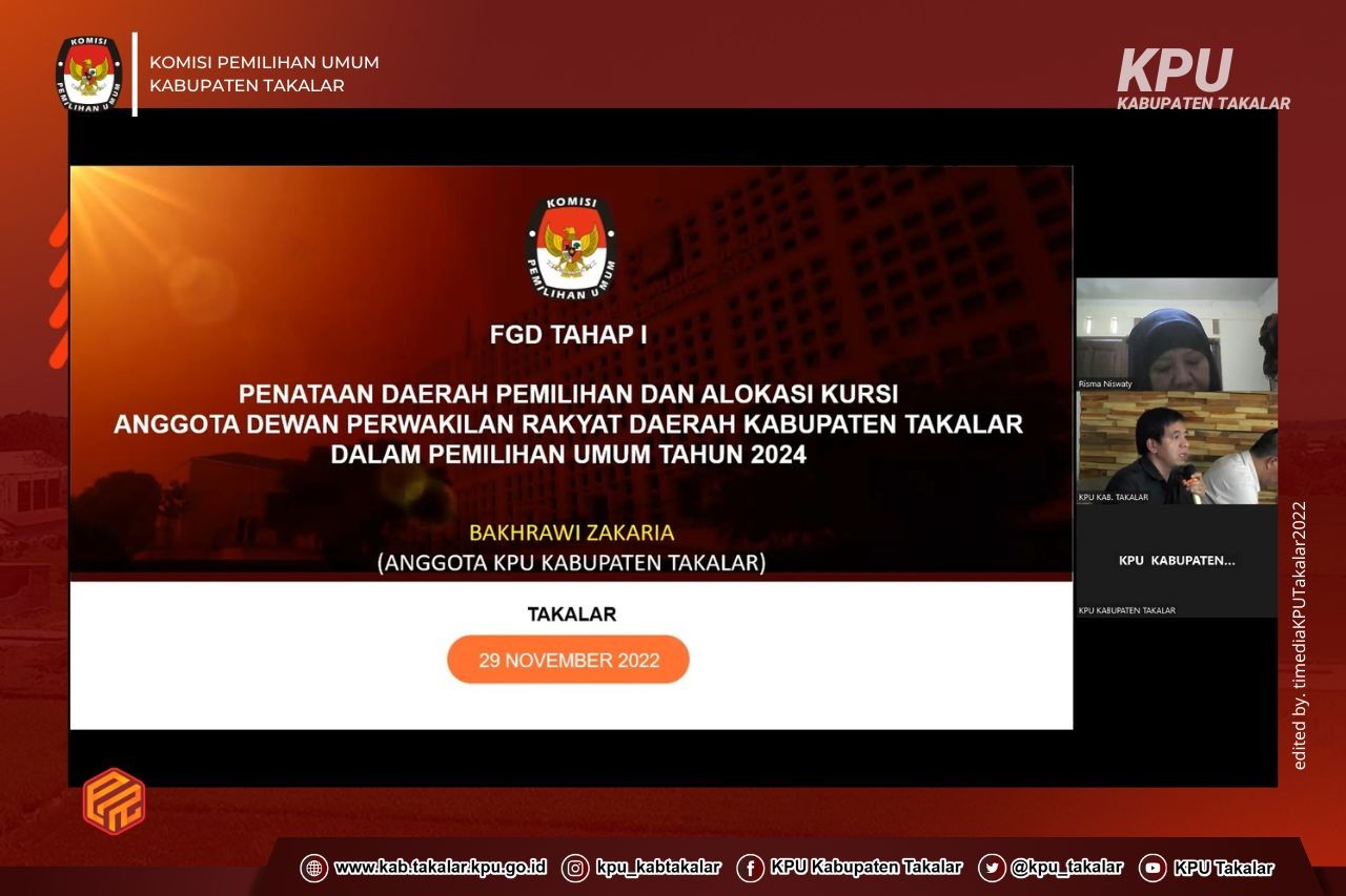 Takalar, kab-takalar.kpu.go.id, Selasa (29/11/2022) KPU Kabupaten Takalar melaksanakan Focus Group Discussion (FGD) Tahap I dalam rangka Penataan Daerah Pemilihan dan Alokasi Kursi Anggota DPRD Kabupaten Takalar dalam Pemilih Umum tahun 2024.