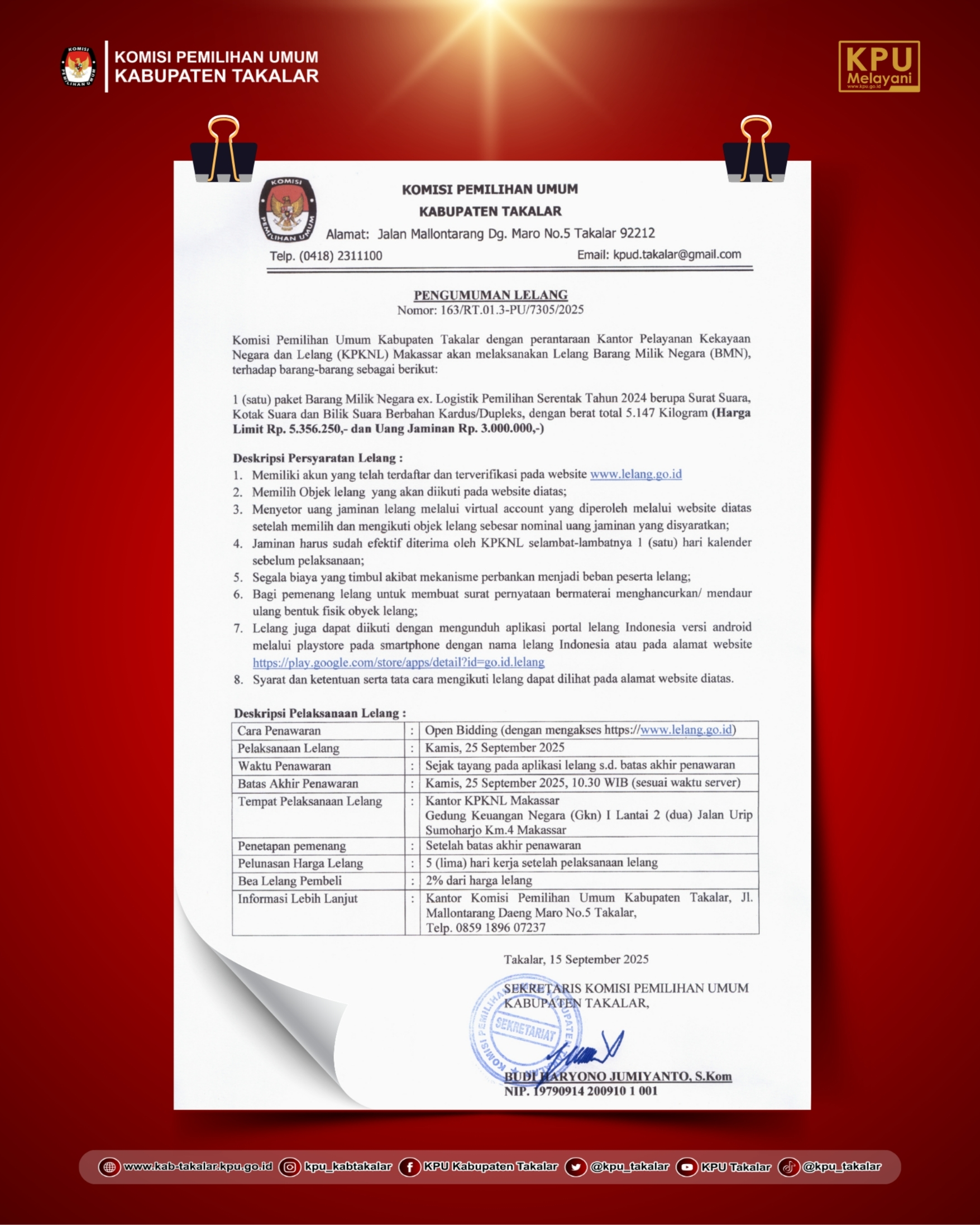 Takalar, kab-takalar.kpu.go.id, Komisi Pemilihan Umum Kabupaten Takalar dengan perantaraan Kantor Pelayanan Kekayaan Negara dan Lelang (KPKNL) Makassar akan melaksanakan Lelang Barang Milik Negara (BMN).