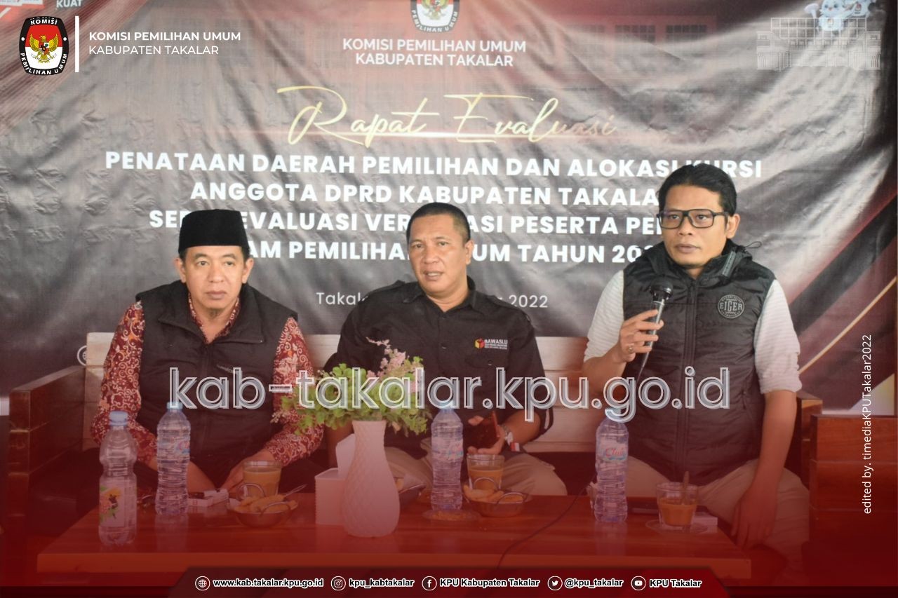 Evaluasi yang dihadiri Ketua dan Anggota KPU Takalar, Ketua dan Anggota Bawaslu serta staf sekretariat KPU Kabupaten Takalar ini membahas hasil pelaksanaan Penataan Daerah Pemilihan dan Alokasi Kursi Anggota DPRD Kabupaten Takalar pada Pemilu tahun 2024 yang saat ini menunggu keputusan atas beberapa rancangan yang telah disusulkan ke KPU RI.