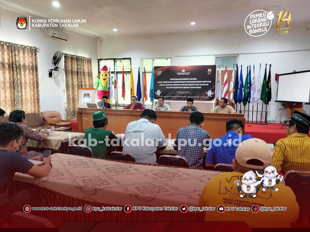 Sebelum menyerahkan, anggota KPU Divisi Teknis Penyelenggaraan Pemilu Bakhrawi Zakaria menyampaikan bahwa sebanyak Lima ratus Sembilan puluh Lima (595) bakal calon yang dokumen persyaratannya telah diverifikasi. Dokumen Berita Acara ini telah memuat keterangan berapa yang Memenuhi Syarat (MS) ataupun Belum Memenuhi Syarat (BMS) disertai masing-masing keterangan. "Melalui aplikasi Sistem Informasi Pencalonan (SILON) KPU, kami telah melakukan verifikasi administrasi terhadap Lima ratus Sembilan puluh Lima (595) Dokumen Bakal Calon anggota DPRD Kabupaten Takalar, hasilnya sebanyak Sembilan belas (19) bakal calon yang dokumennya dinyatakan Memenuhi Syarat (MS) dan sisanya sebanyak Lima ratus Tujuh puluh Enam (576) dinyatakan Belum Memenuhi Syarat (BMS)."papar Bakhrawi.