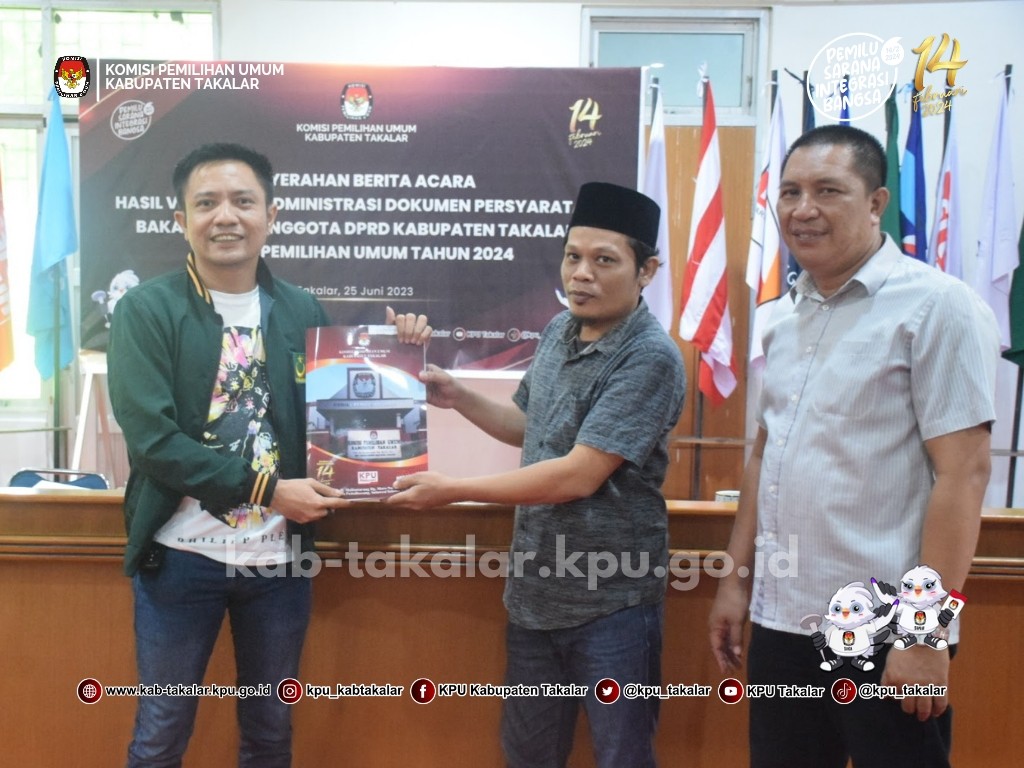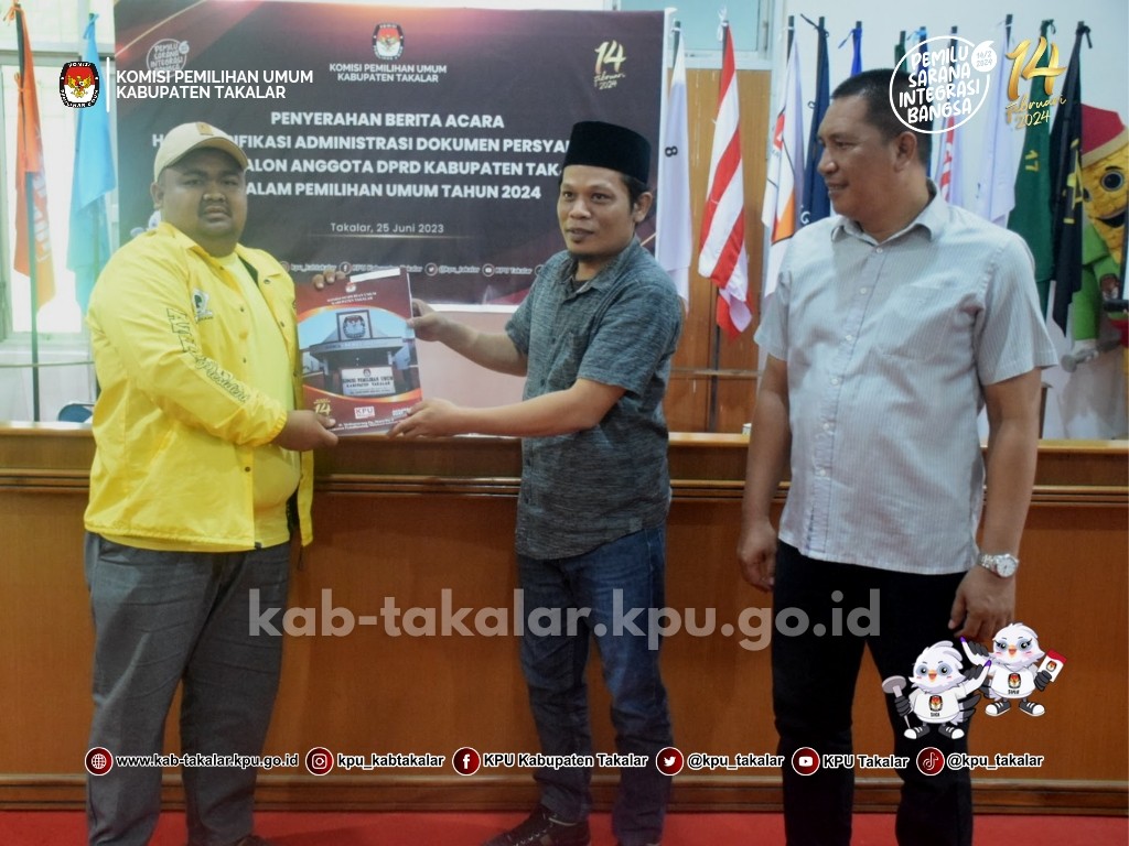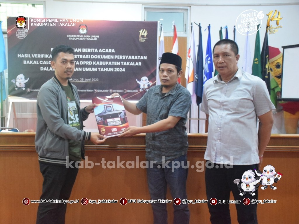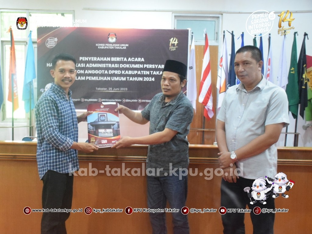 Takalar, kab-takalar.kpu.go.id, Minggu (25/6/2023) KPU Kabupaten Takalar menyerahkan Berita Acara hasil Verifikasi Administrasi Dokumen Persyaratan Bakal Calon Anggota DPRD Kabupaten Takalar Dalam Pemilihan Umum tahun 2024.