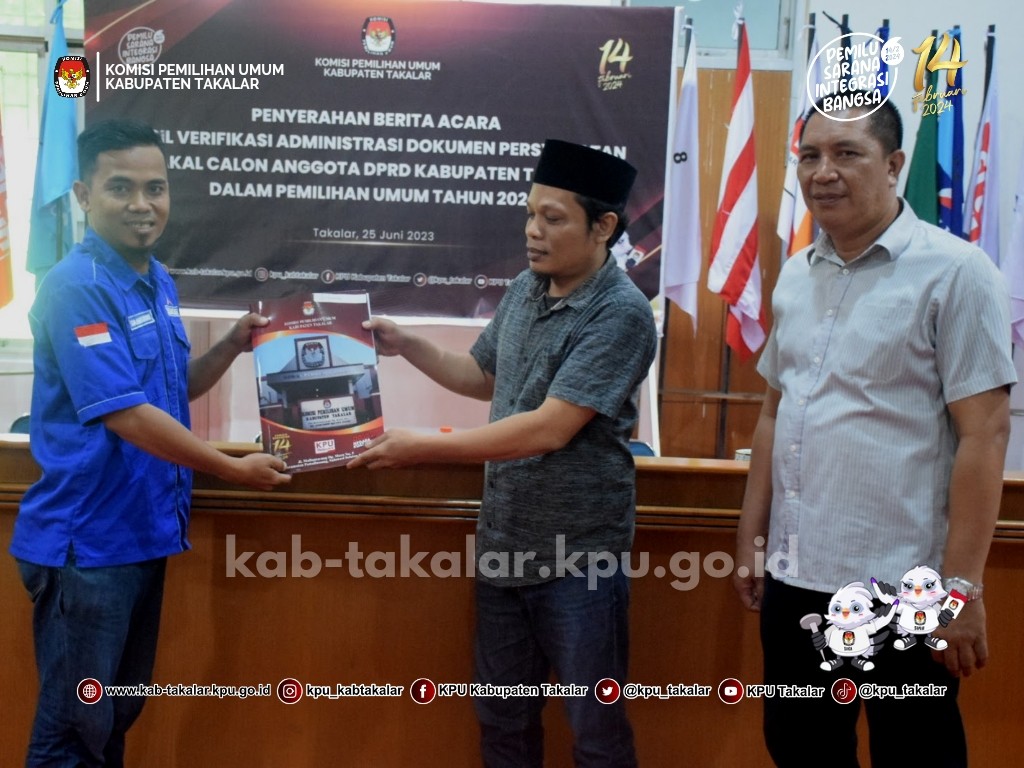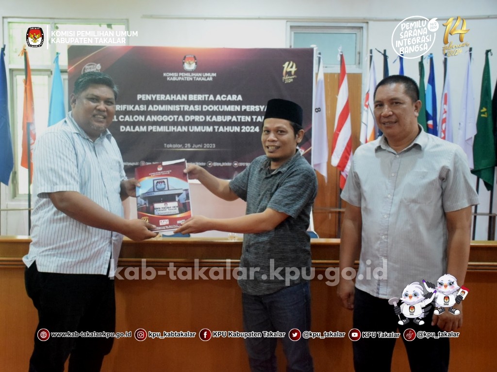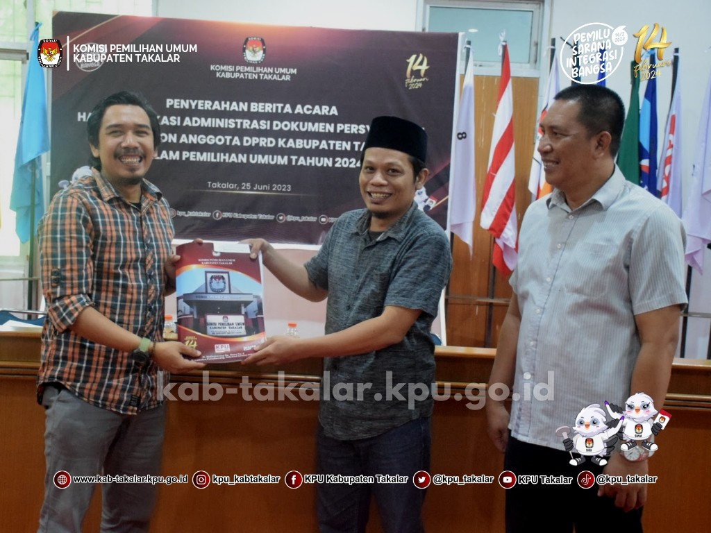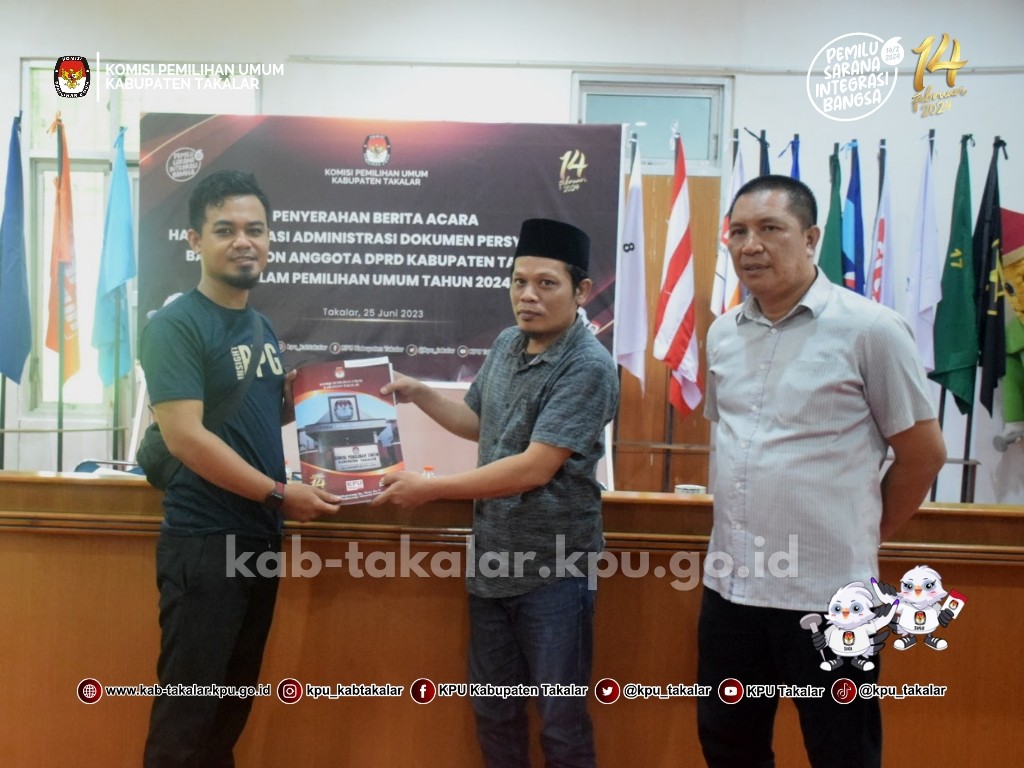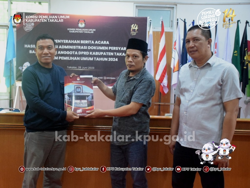 Takalar, kab-takalar.kpu.go.id, Minggu (25/6/2023) KPU Kabupaten Takalar menyerahkan Berita Acara hasil Verifikasi Administrasi Dokumen Persyaratan Bakal Calon Anggota DPRD Kabupaten Takalar Dalam Pemilihan Umum tahun 2024.