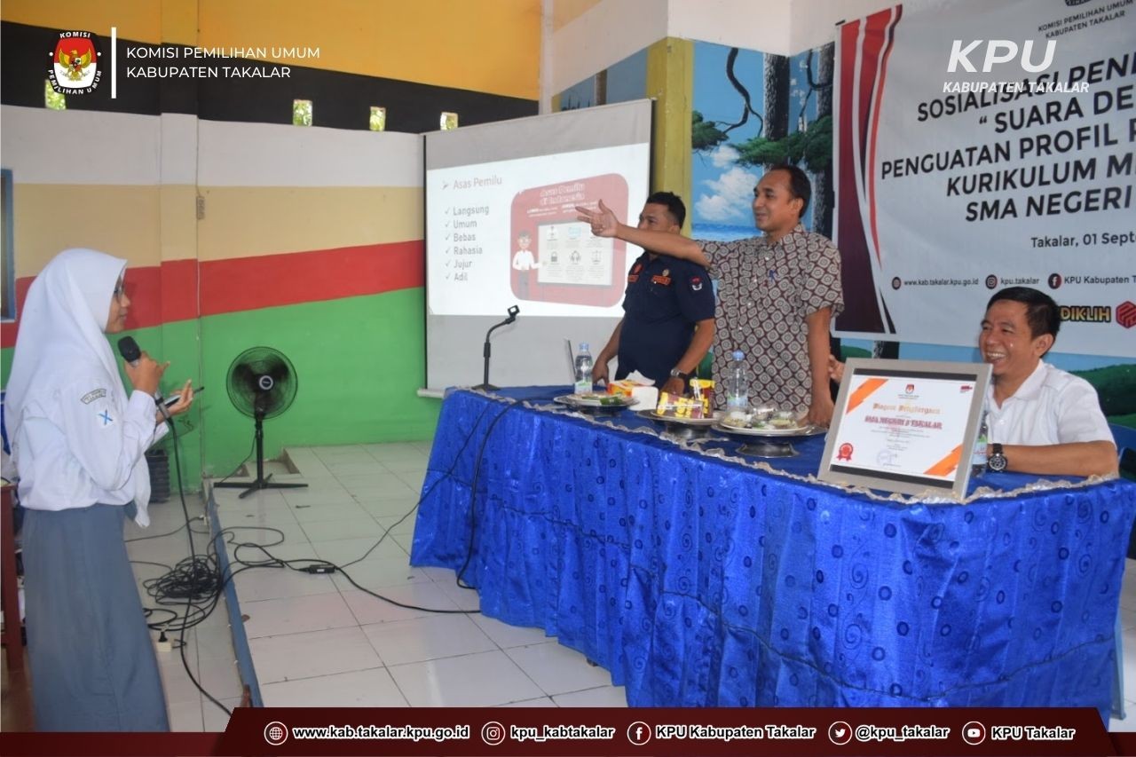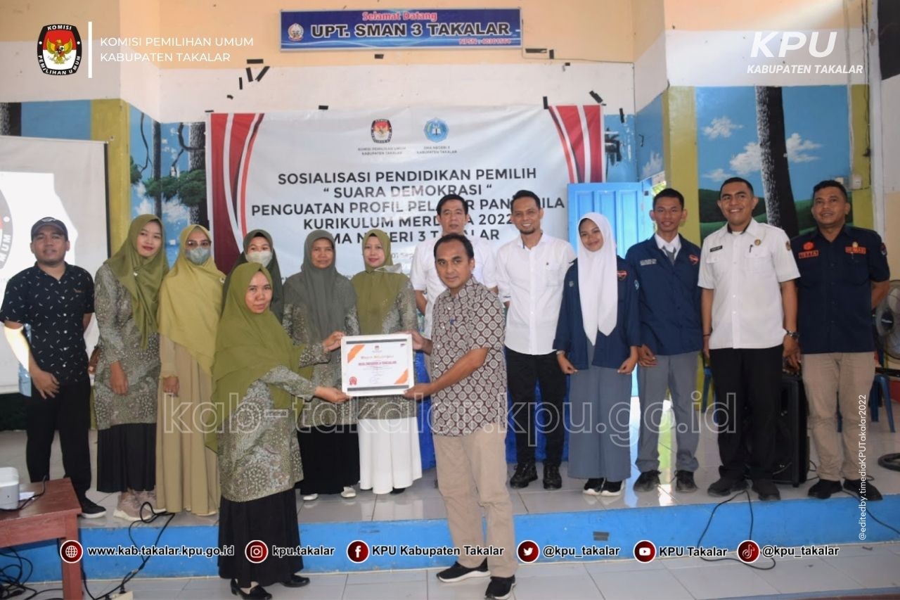 Hadir dalam kegiatan ini Ketua KPU Takalar Muhammad Darwis, anggota KPU Divisi Hukum dan Pengawasan Muhammad Nur Arfah, Kasubbag Teknis dan Hupmas Azhari Jupri serta staf, Kepala SMA Negeri 3 Takalar bersama guru-guru pembimbing. Atas nama KPU Takalar, Darwis menyampaikan terima kasih kepada SMA Negeri 3 Takalar atas fasilitasi, kerjasama dan pelibatan KPU Takalar dalam kegiatan Kurikulum Merdeka 2022 untuk Penguatan Profil Pelajar Pancasila dengan temas SUARA DEMOKRASI. (humas kpu takalar fiank/ed/red)