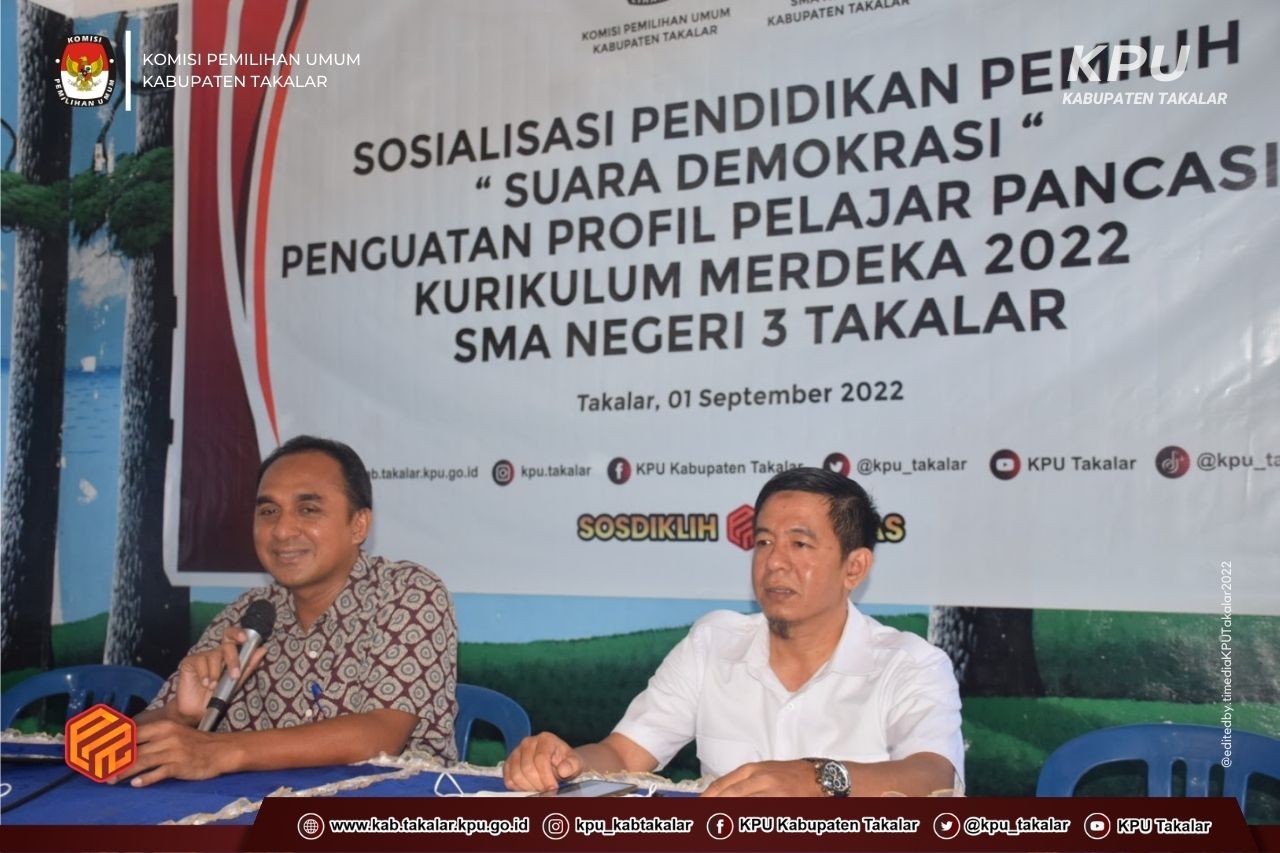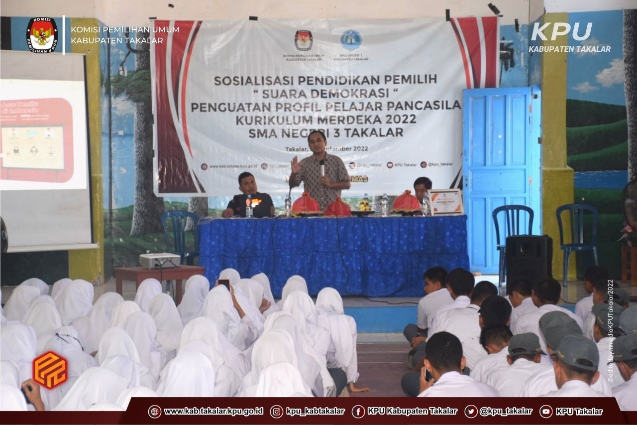 Takalar, kab-takalar.kpu.go.id, Giat Sosialisasi dan Pendidikan Pemilih terus digencarkan KPU Kabupaten Takalar, kali ini Divisi Sosialisasi Pendidikan Pemilih dan Partisipasi Masyarakat (SOSDIKLIH PARMAS) mengunjungi SMA Negeri 3 Takalar yang merupakan rangkaian kegiatan sosialisasi yang bertajuk SUARA DEMOKRASI dalam rangka Penguatan Profile Pelajar Pancasila bagi pelajar SMA Negeri 3 Takalar yang menjadi salah satu sekolah yang telah menerapkan kurikulum Merdeka Belajar.