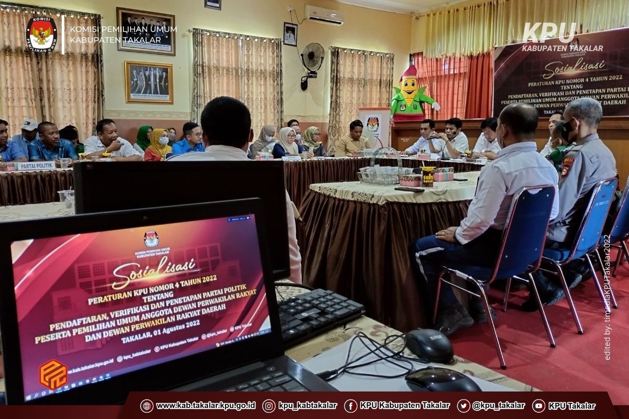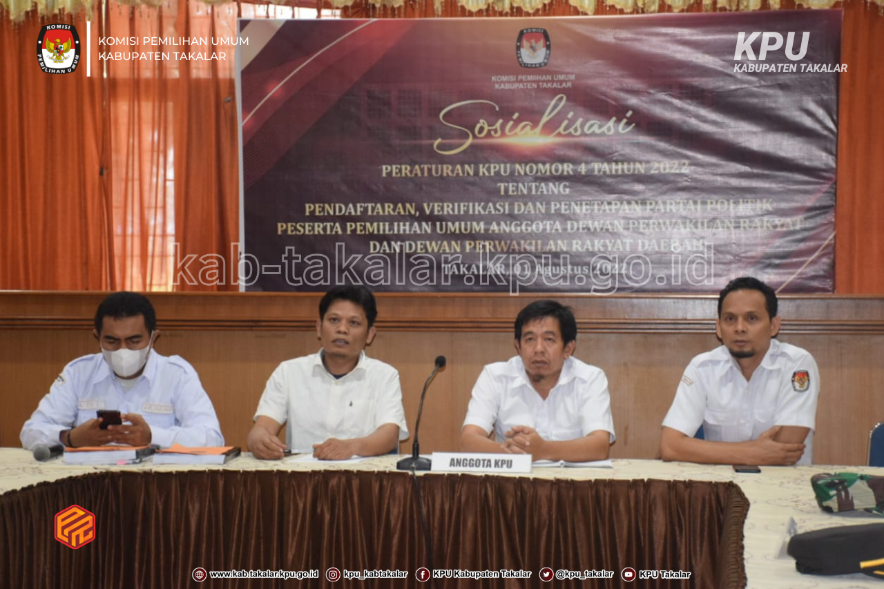 Takalar, kab-takalar.kpu.go.id, Komisi Pemilihan Umum (KPU) Kabupaten Takalar mengadakan Sosialisasi Peraturan KPU Nomor 4 Tahun 2022 Tentang Pendaftaran, Verifikasi dan Penetapan Partai Politik Peserta Pemilihan Umum Anggota Dewan Perwakilan Rakyat dan Dewan Perwakilan Rakyat Daerah, Senin (1/8/2022).