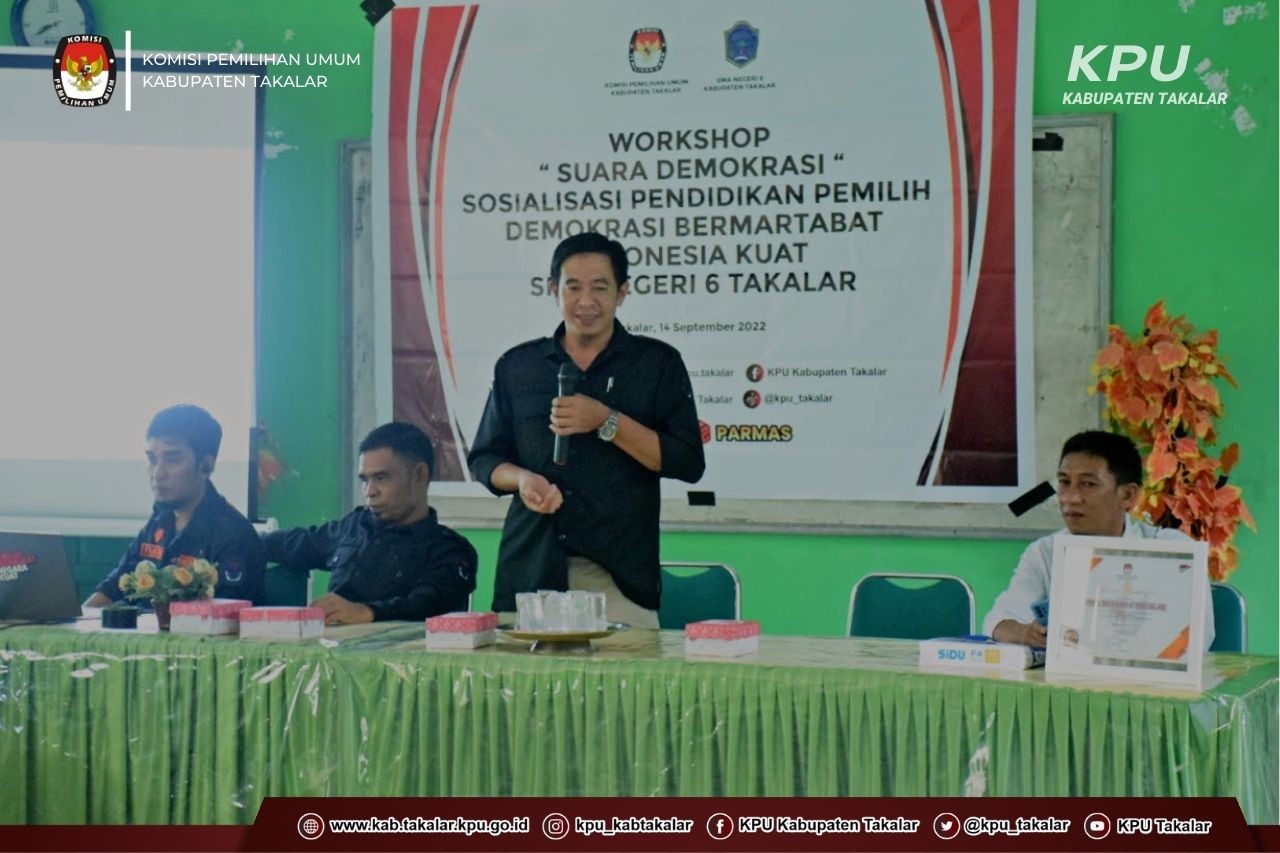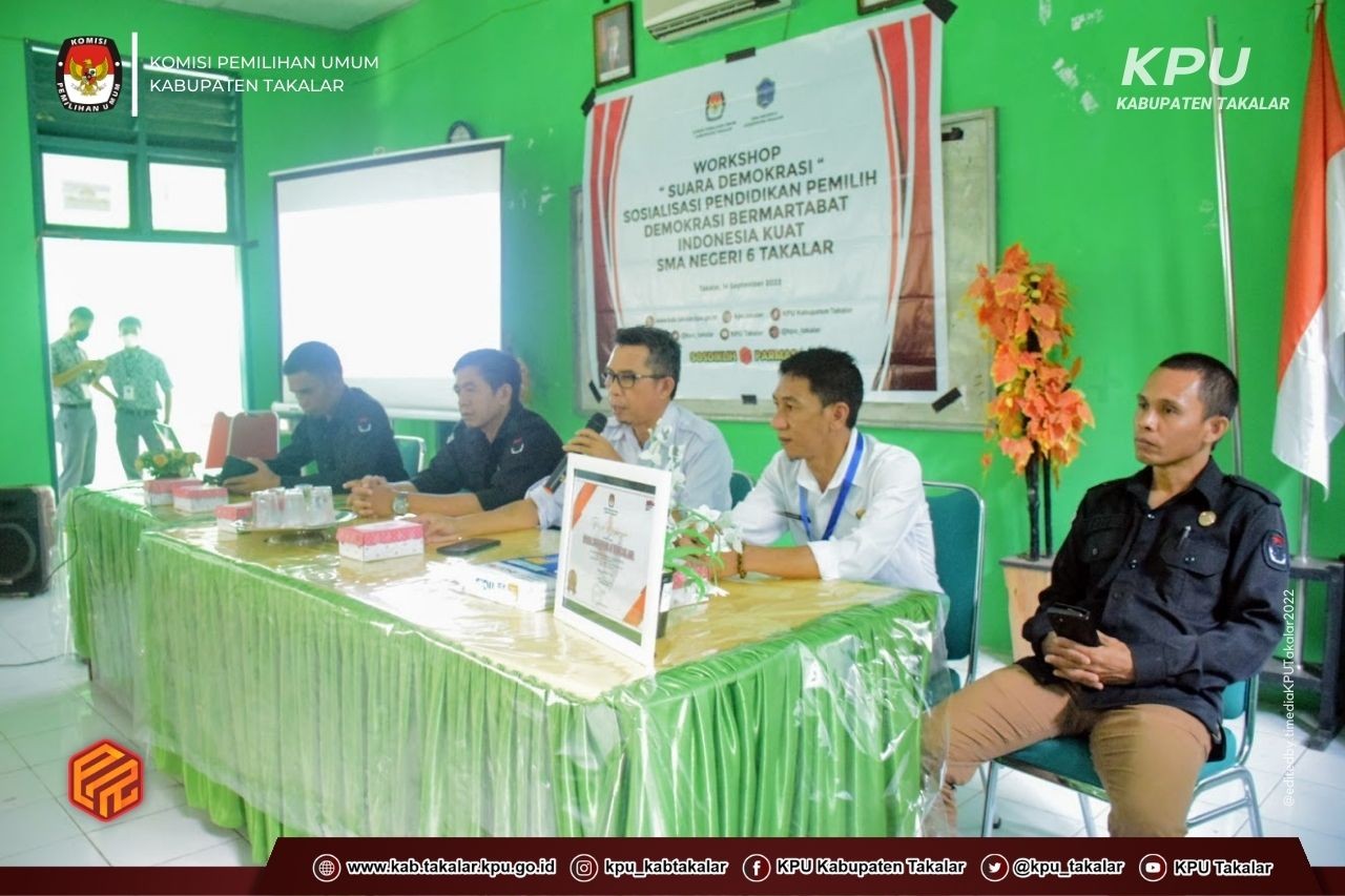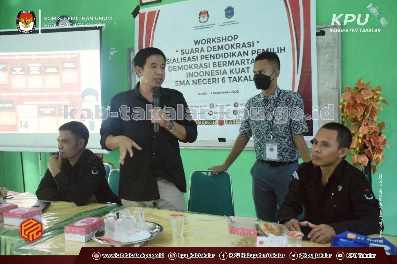 "Workshop Suara Demokrasi dengan topik Demokrasi Bermartabat Indonesia Kuat ini sangat baik dan sejalan dengan Program Sosialisasi Pendidikan Pemilih yang gencar dilaksanakan oleh KPU Takalar, karena dengan kegiatan ini akan memberikah pemahaman yang lebih baik tentang kepemiluan sejak dini kepada para pelajar yang akan menjadi pemilih pemula pada Pemilu Serentak tahun 2024, terlebih SMA Negeri 6 akan melaksanakan Pemilihan Ketua dan Wakil Ketua OSIS tahun ini, sehingga sebagai sekolah penggerak, SMA Negeri 6 Takalar bisa menjadi miniatur dalam penerapan sistem Pemilu pada pemilihan ketua dan wakil ketua OSIS.”jelas Darwis.