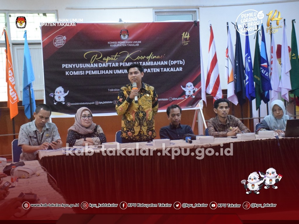 Takalar, kab-takalar.kpu.go.id, Anggota KPU Divisi Perencanaan, Data dan Informasi (Rendatin) A. Jimmi Rusman didampingi anggota KPU Divisi Hukum dan Pengawasan Muhammad Ridwan didampingi Sekretaris Budi Haryono Jumiyanto, Kasubag Rendatin Irmawati Thahir, Kasubag Keuangan, Umum dan Logistik (KUL) Ridwan serta Operator SIDALIH Nurhalimah, membuka Rapat Koordinasi Penyusunan Daftar Pemilih Tambahan (DPTb), Jum'at (4/8/2023) di Aula sekretariat KPU Takalar.