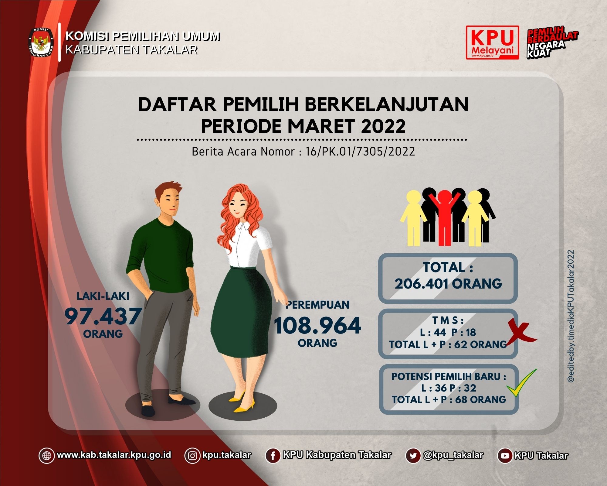Takalar, kab-takalar.kpu.go.id, Senin (04/4) Komisi Pemilihan Umum Kabupaten Takalar kembali menetapkan jumlah data pemilih hasil Pemutakhiran Daftar Pemilih Berkelanjutan (PDPB) periode Maret 2022.