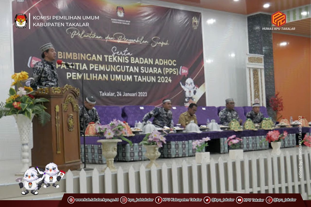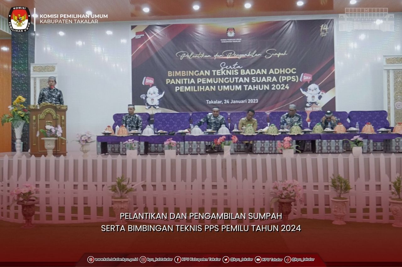 Takalar, kab-takalar.kpu.go.id, Selasa (24/01/2023) KPU Kabupaten Takalar melaksanakan Pelantikan dan Pengambilan Sumpah serta Bimbingan Teknis kepada 330 orang anggota Panitia Pemungutan Suara (PPS) untuk Pemilu tahun 2024 di Hotel Wisata Pantai Topejawa Kabupaten Takalar.