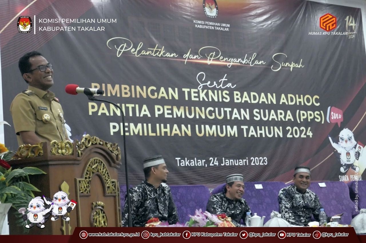 Ketua KPU Takalar Muhammad Darwis dalam sambutannya menyampaikan apresiasi dan berpesan kepada seluruh anggota PPS agar senantiasa menjaga netralitas dan integritas dalam menjalankan tugas sebagai penyelenggara Pemilu. "Hari ini kita menyaksikan seluruh penyelenggara mengenakan busana adat makassar, sekilas ini tampak seperti kegiatan dinas pariwisata, bukan KPU. Raut wajah yang ceria seperti ini tentu menambah energi positif bagi kita semua dalam menyongsong Pemilu dan Pemilihan Serentak tahun 2024 dengan penuh semangat. Kepada teman-teman PPS yang baru saja dilantik, kami mengingatlkan agar tetap menjaga netralitas dan integritas, jangan pernah terlibat apalagi menjadi salah satu tim sukses salah satu partai politik ataupun calon peserta pemilu, mari bersama kita menjaga iklim demokrasi di Kabupaten Takalar agar selalu kondisif, sehingga sukses pemilu dan pemilihan serentak tahun 2024 akan kita raih bersama."jelas Darwis sembari menambahkan agar seluruh anggota PPS segera membentuk Petugas Pemutahiran Data Pemiih (Pantarlih).
