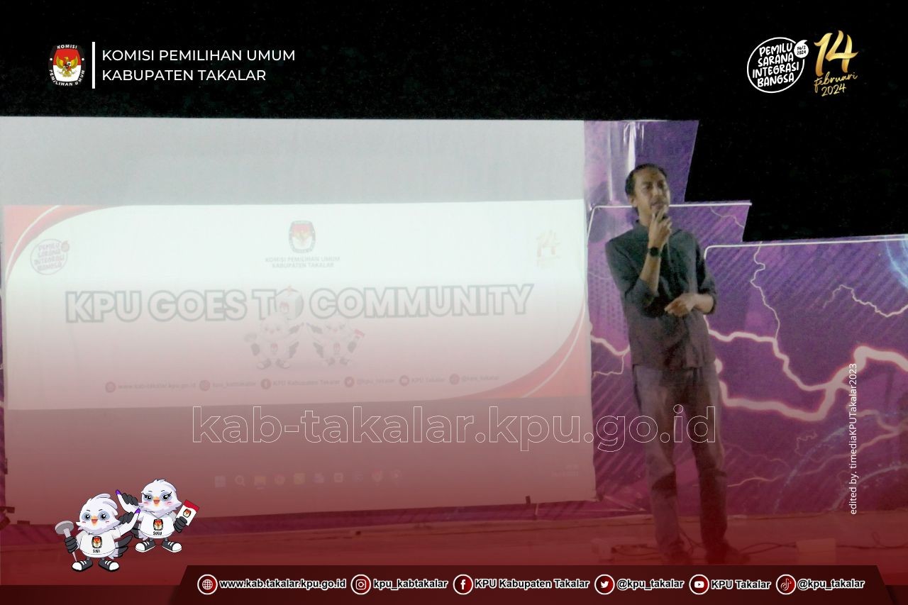 Takalar, kab-takalar.kpu.go.id, Pemilu Serentak 2024 tersisa 77 hari lagi, segenap warga bangsa diharapkan menggunakan hak pilihnya pada Rabu 14 Februari 2024. Hal ini disampaikan Anggota KPU Divisi Hukum dan Pengawasan Muhammad Ridwan pada kegiatan Sosialisasi KPU GOEST TO COMMUNITY, bersama Komunitas Sanggar dan Pegiat Seni se Kabupaten Takalar di Taman Kota, Selasa (27/11/2023).
