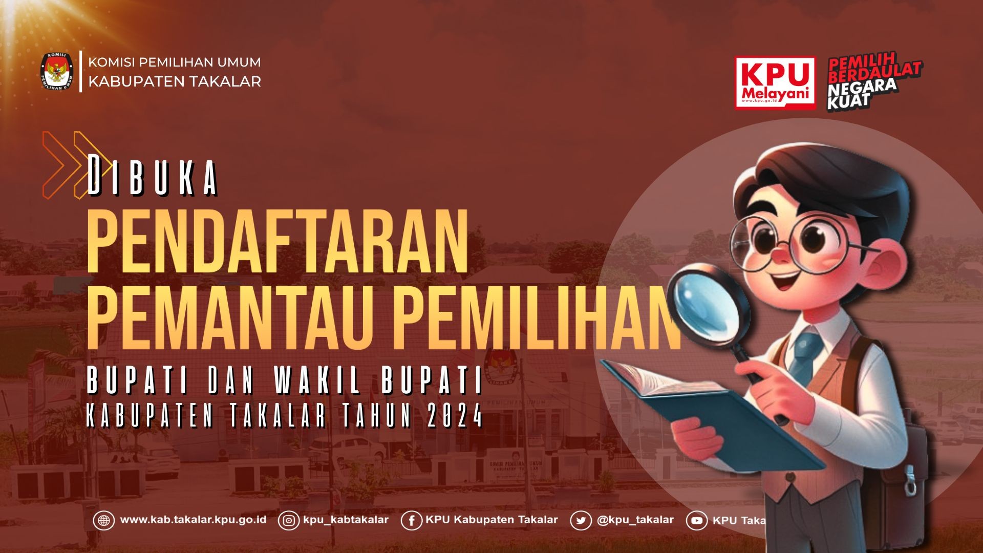 Dalam rangka melaksanakan ketentuan Pasal 42 Peraturan Komisi Pemilihan Umum Nomor 9 Tahun 2022 tentang Partisipasi Masyarakat dalam Pemilihan Umum dan Pemilihan Gubernur dan Wkail Gubernur, Bupati dan Wakil Bupati, dan/atau Bupati dan Wakil Bupati serta Peraturan Komisi Pmeilihan Umum Nomor 2 Tahun 2024 tentang Tahapan dan Jadwal Pemilihan Gubernur dan Wakil Gubernur, Bupati dan Wakil Bupati, dan/atau Bupati dan Wakil Bupati Tahun 2024, Komisi Pemilihan Umum Kabupaten Takalar menerima Pendaftaran bagi Pemantau Pemilihan Dalam Negeri yang ingin berpartisipasi dalam Tahapan Pemilihan Bupati dan Wakil Bupati Kabupaten Takalar Tahun 2024, dengan ketentuan sebagai berikut: