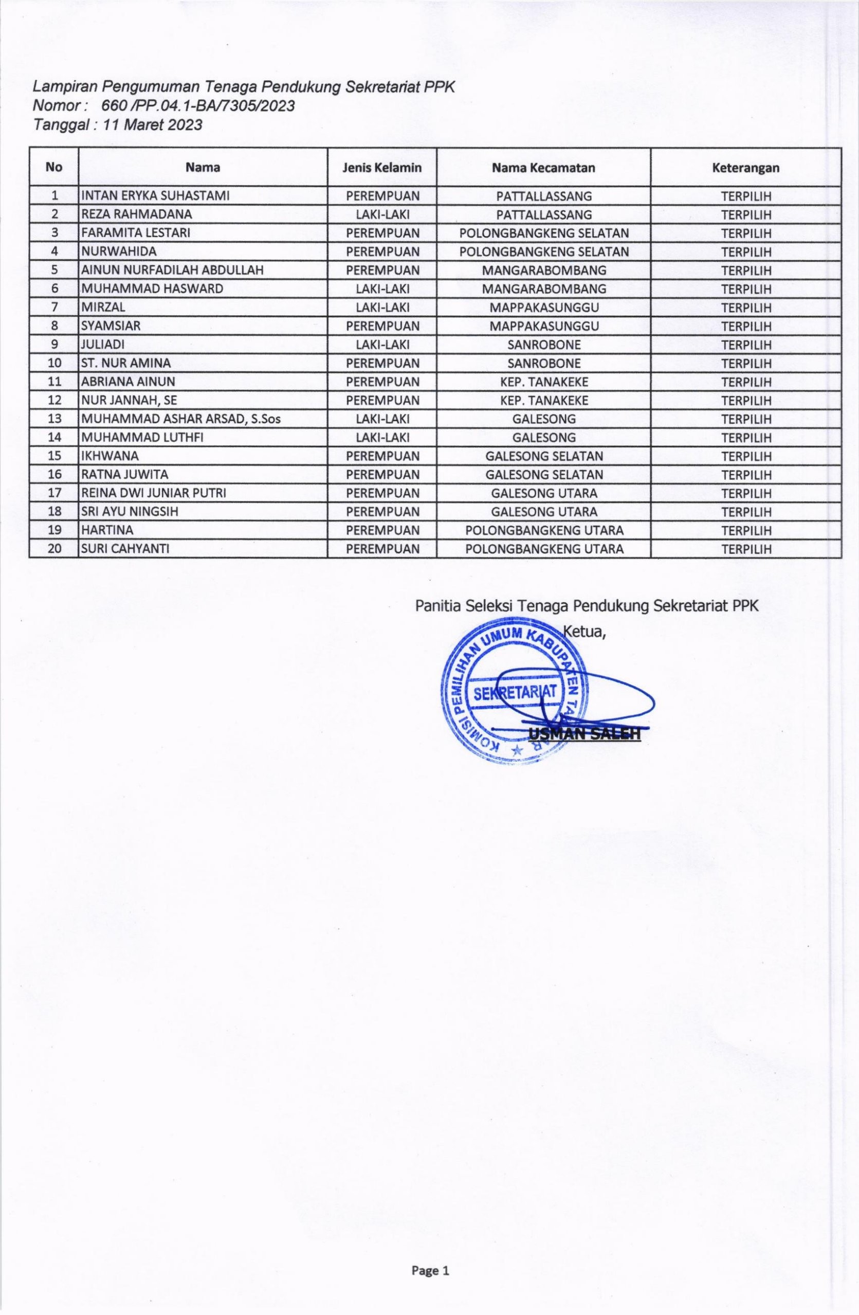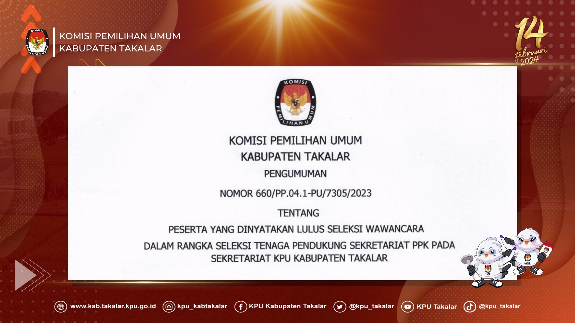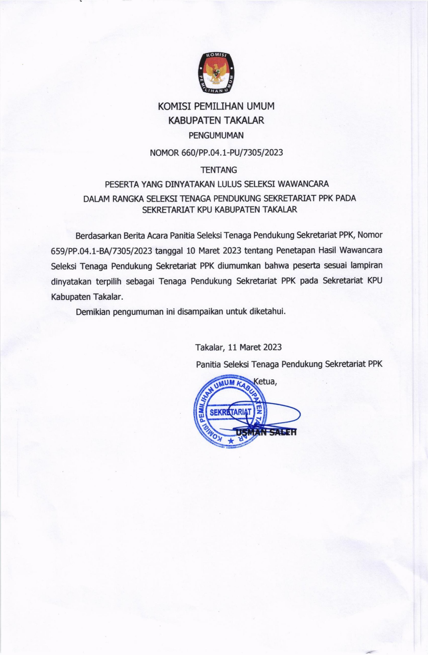 Penetapan Hasil Wawancara Seleksi Tenaga Pendukung Sekretariat PPK Sabtu, 11 Maret 2023 09:30 121 Unduh File Bagikan: Dilihat 121 Kali.