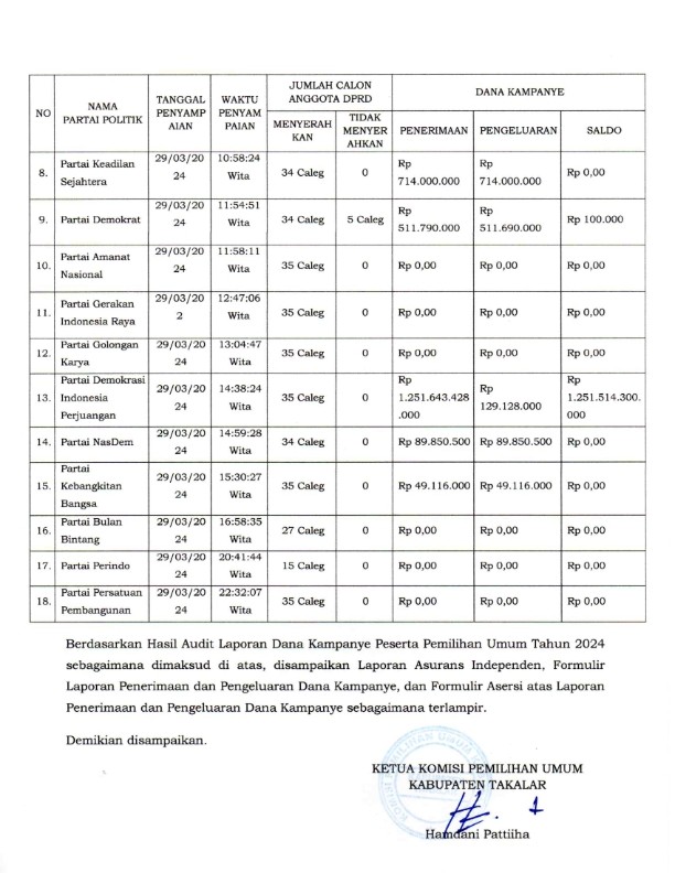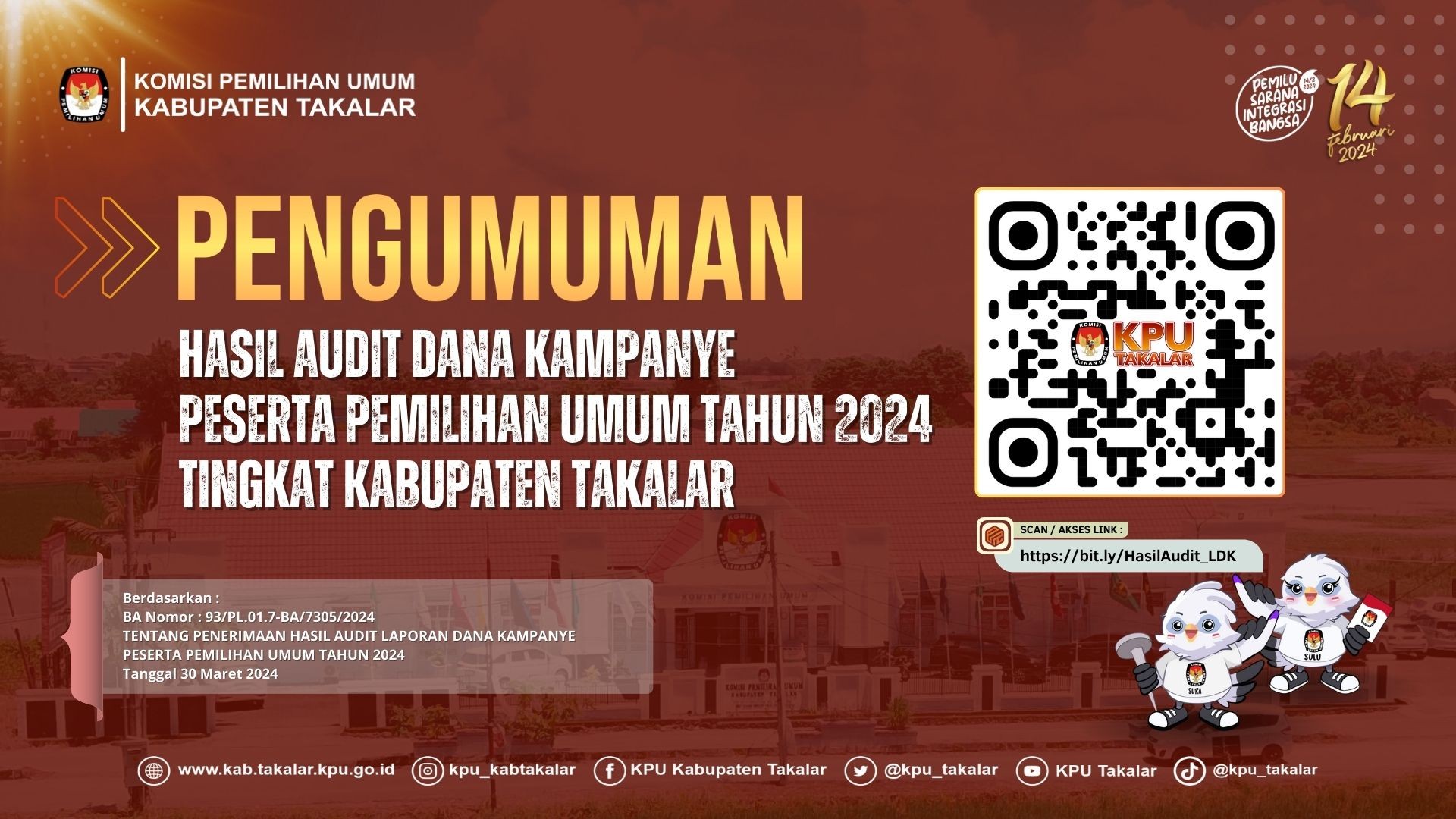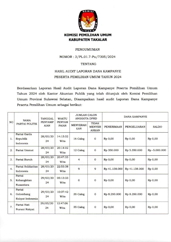 Pengumuman Hasil Audit Laporan Dana Kampanye Peserta Pemilihan Umum Tahun 2024 tingkat Kabupaten Takalar