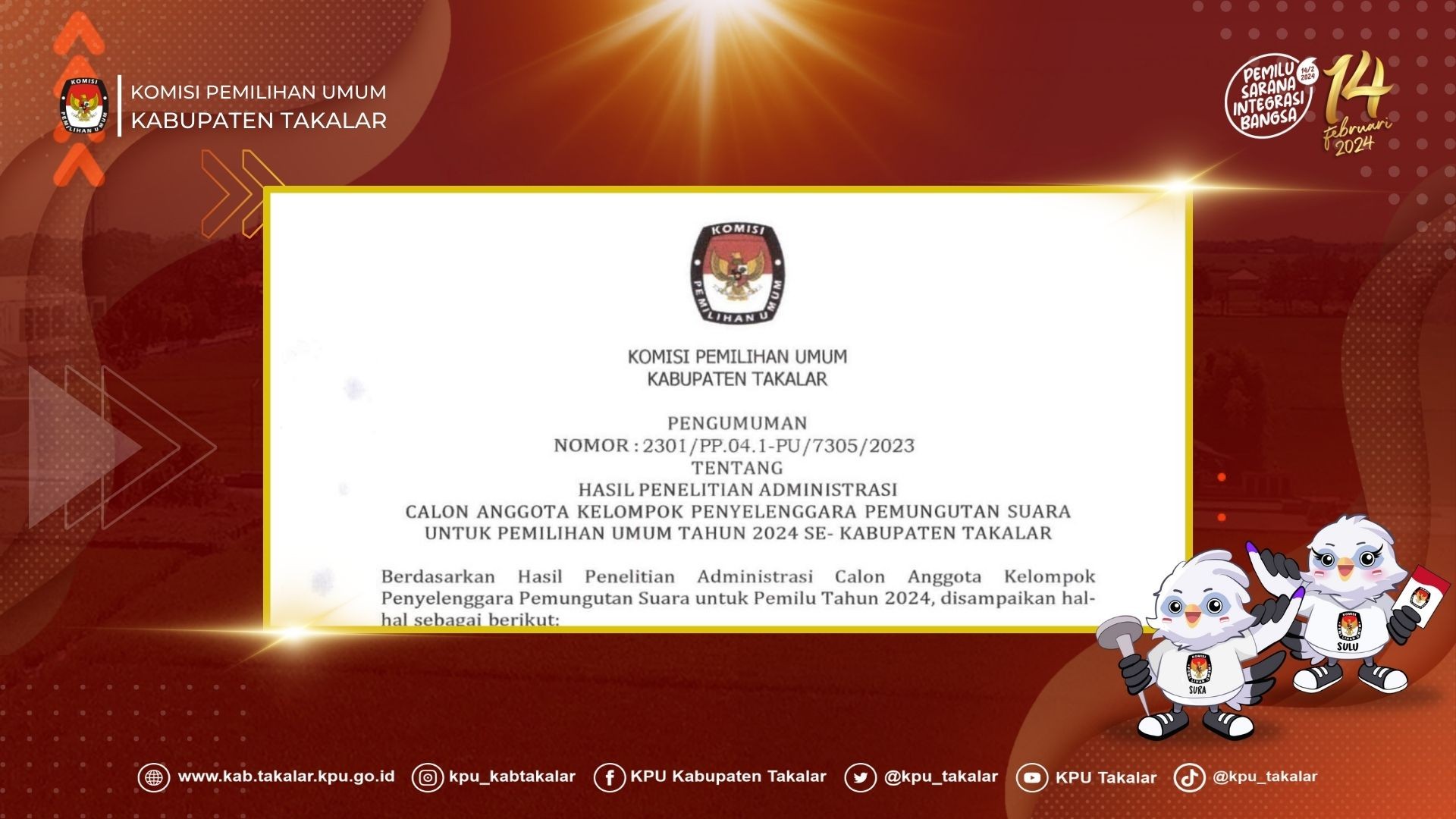 Pengumuman Hasil Penelitian Adminstrasi Calon Anggota KPPS Pemilu Tahun 2024 se Kabupaten Takalar Senin, 26 Januari 1970 00:01 657 Untuk Pengumuman KLIK DISINI Bagikan: Dilihat 657 Kali.