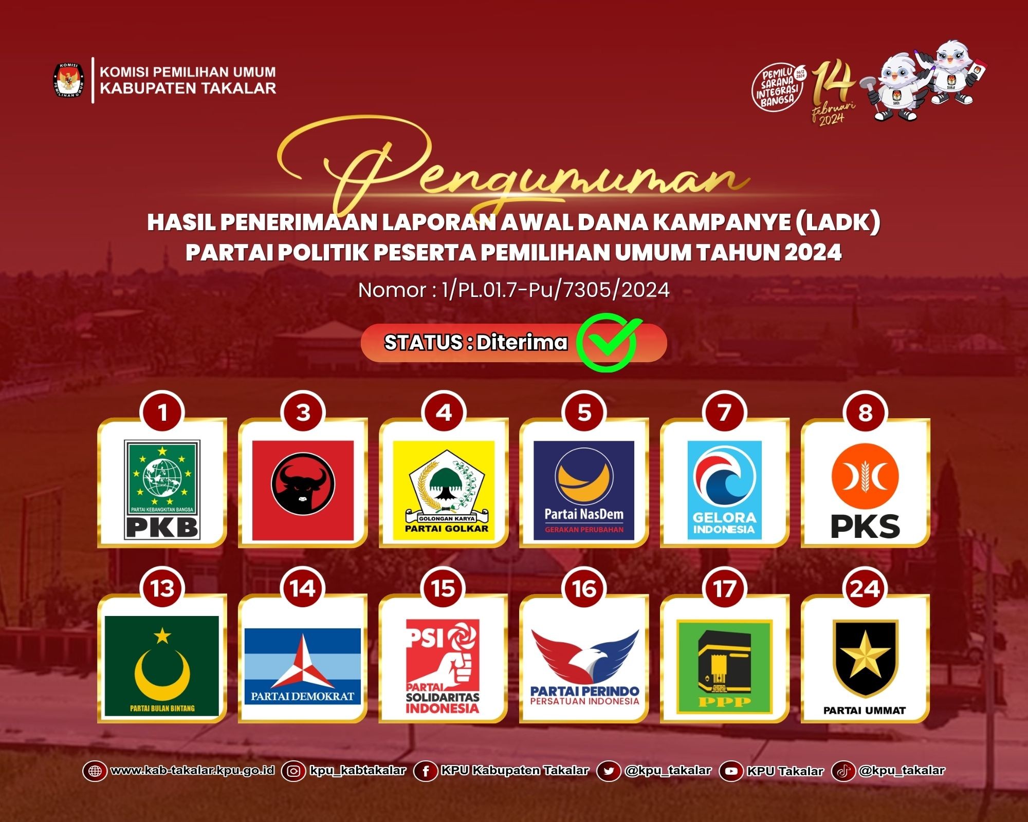 Takalar, kab-takalar.kpu.go.ig, Komisi Pemilihan Umum Kabupaten Takalar mengumumkan Hasil Penerimaan Laporan Awal Dana Kampanye (LADK) Peserta Pemilu se Kabupaten Takalar Tahun 2024, Senin (8/1/2024).