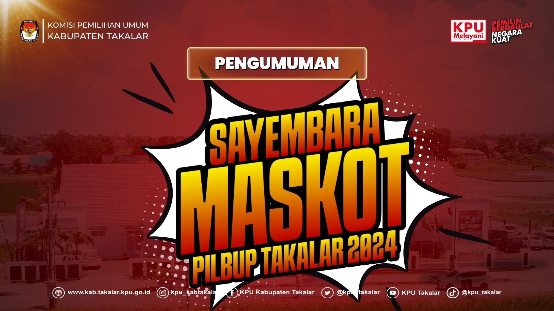 Takalar, kab-takalar.kpu.go.id - Teman Pemilih, mari ki' berpartisipasi dalam Lomba Sayembara Maskot Pemilihan Bupati dan Wakil Bupati Takalar Tahun 2024. Tunjukkan karya terbaikmu dan bagi pemenang Maskot, karyanya akan digunakan pada seluruh kegiatan tahapan Pilkada Serentak Tahun 2024 di Kabupaten Takalar.