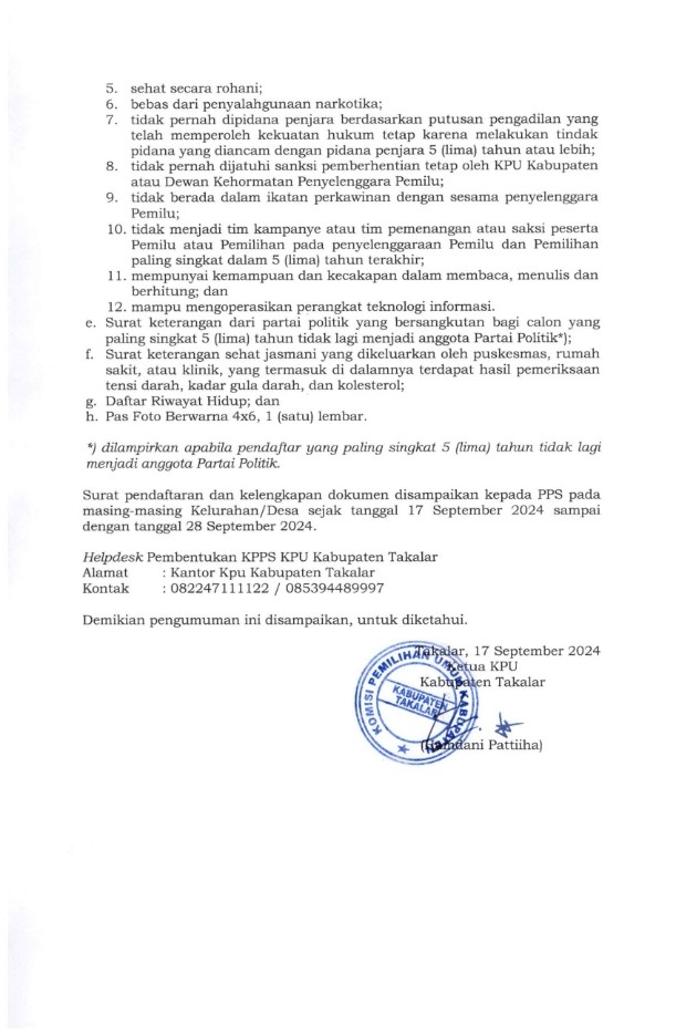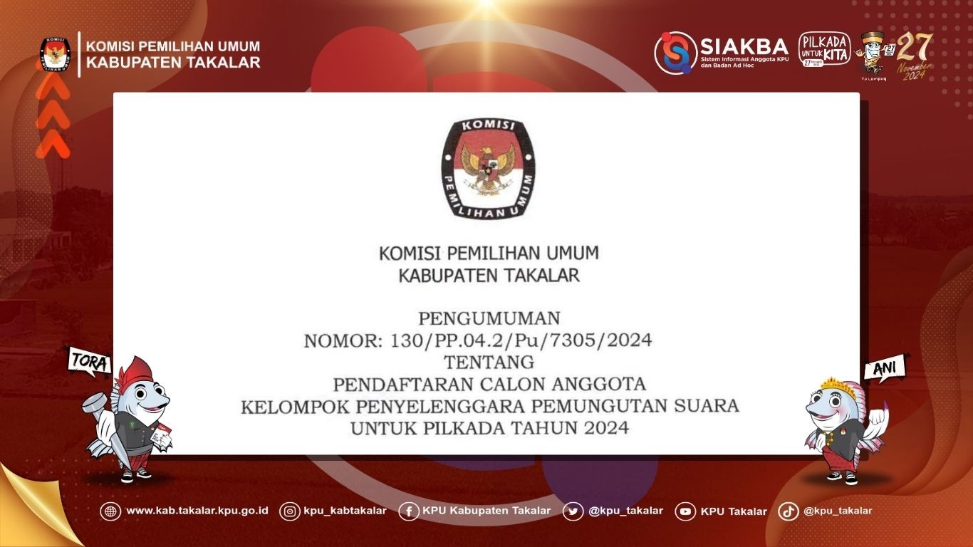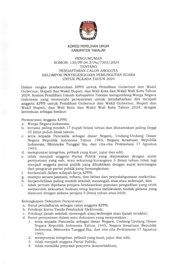 Berikut Pengumuman Pendaftaran Calon Anggota KPPS Untuk PILKADA Tahun 2024 Nomor : 130/PP.04.2/Pu/7305/2024 tanggal 17 September 2024.