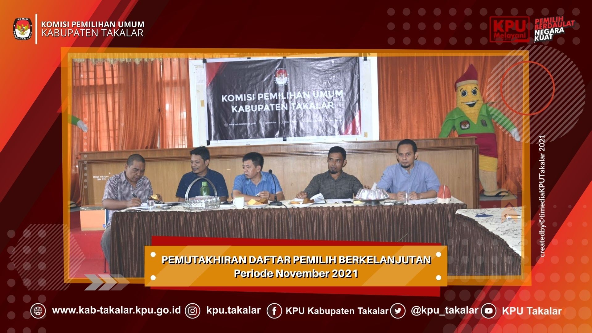 Takalar, kab-takalar.kpu.go.id, Rapat Pleno Pemutakhiran Daftar Pemilih Berkelanjutan (PDPB) untuk periode November 2021 telah dilaksanakan pada hari Rabu (1/12). Rapat yang dipimpin ketua KPU Muhammad Darwis yang diampingi Anggota turut dihadiri Sekretaris bersama seluruh jajaran sekretariat KPU Kabupaten Takalar dilaksanakan di Aula Kantor KPU Kab. Takalar.