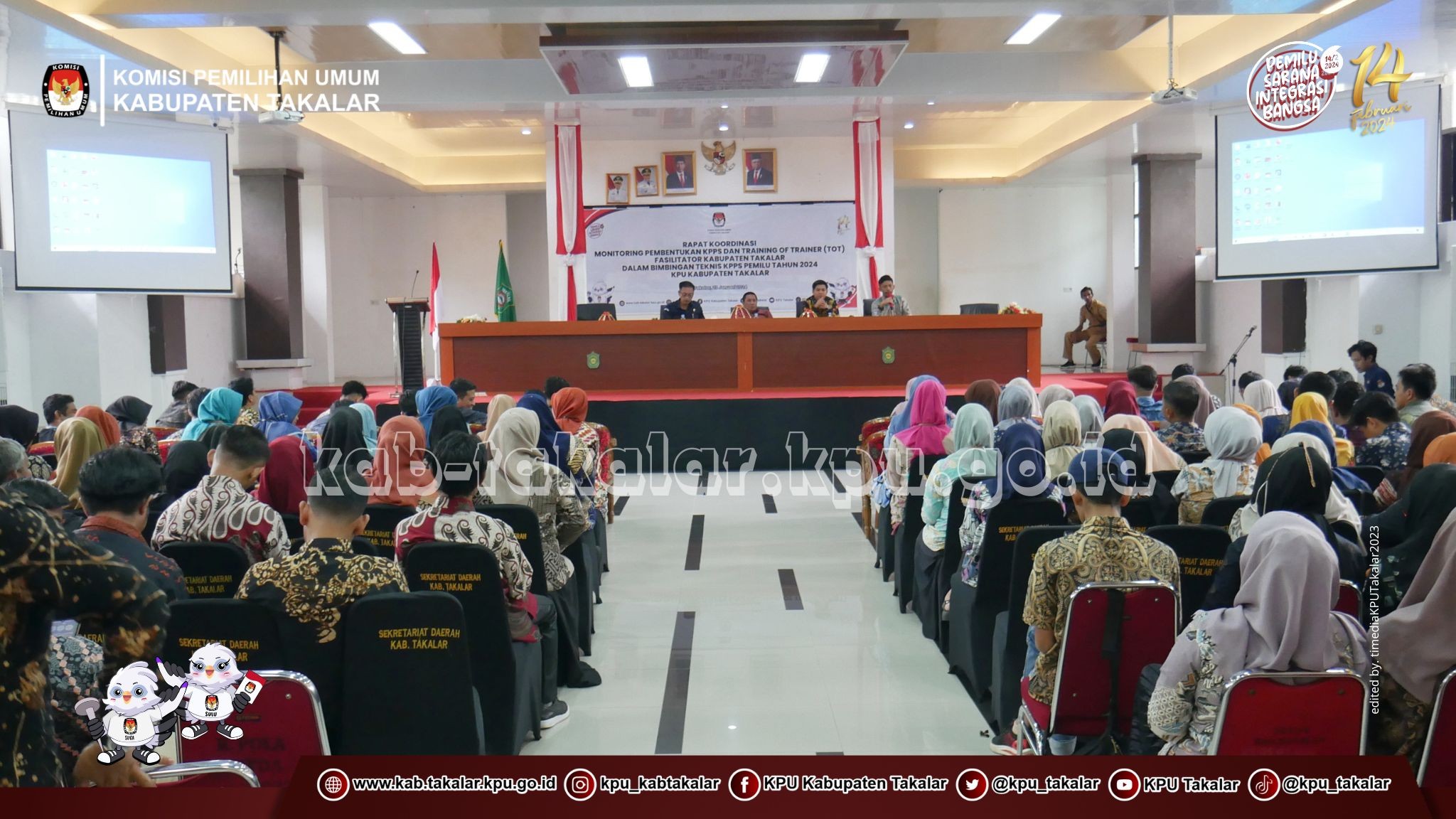 Takalar, kab-takalar.kpu.go.ig, Bertempat di Ruang Pola Kantor Bupati Takalar, KPU Kabupaten Takalar melaksanakan Rapat Koordinasi Monitoring Pembentukan KPPS Dan Training of Trainer (ToT) Fasilitator Kabupaten Takalar dalam Bimbingan Teknis KPPS Pemilu Tahun 2024 KPU Kabupaten Takala, Selasa (23/1/2024).