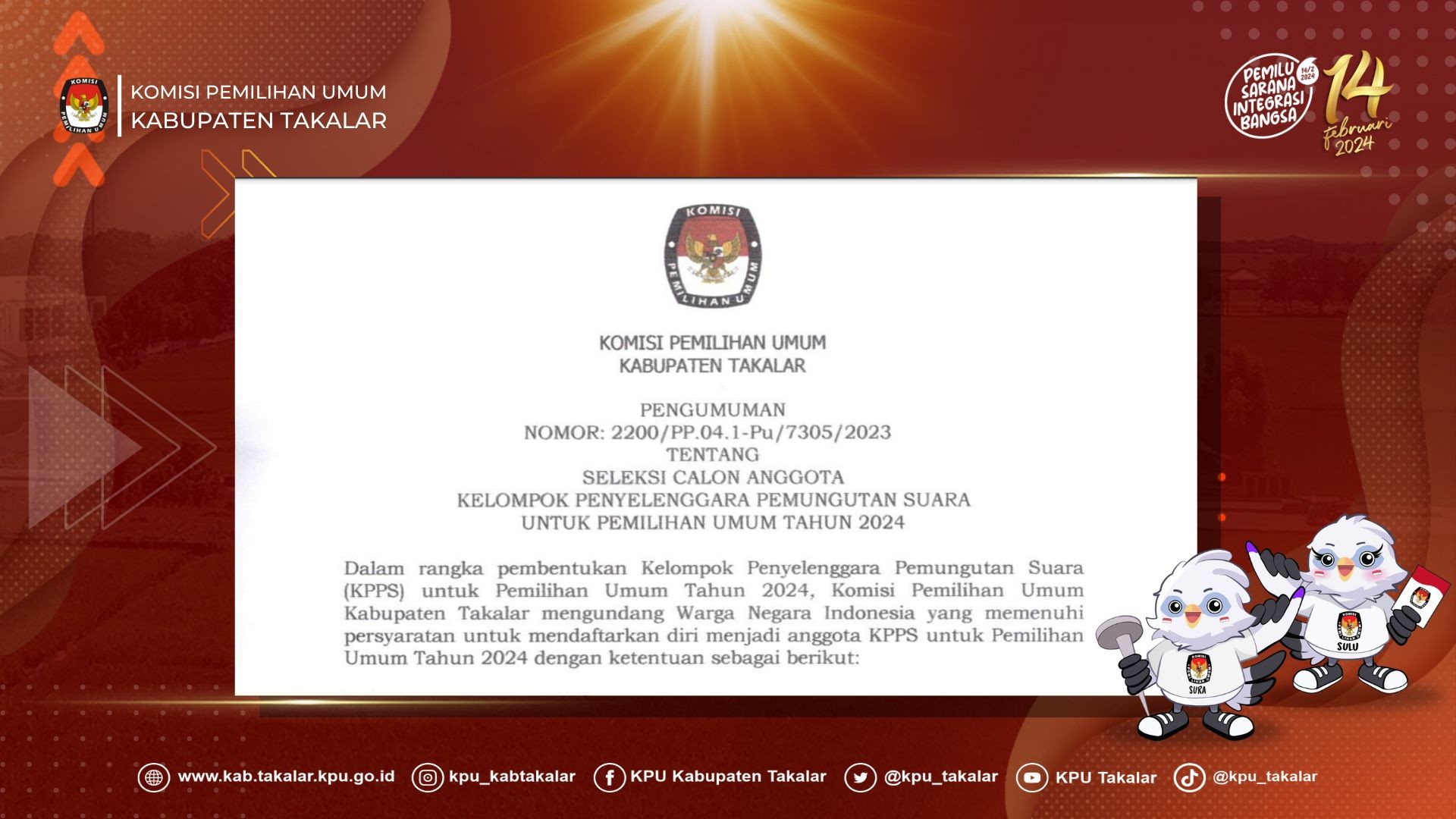 SELEKSI CALON ANGGOTA KELOMPOK PENYELENGGARA PEMUNGUTAN SUARA UNTUK PEMILIHAN UMUM TAHUN 2024 Senin, 11 Desember 2023 00:01 391 Pengumuman Klik Disini Bagikan: Dilihat 391 Kali.