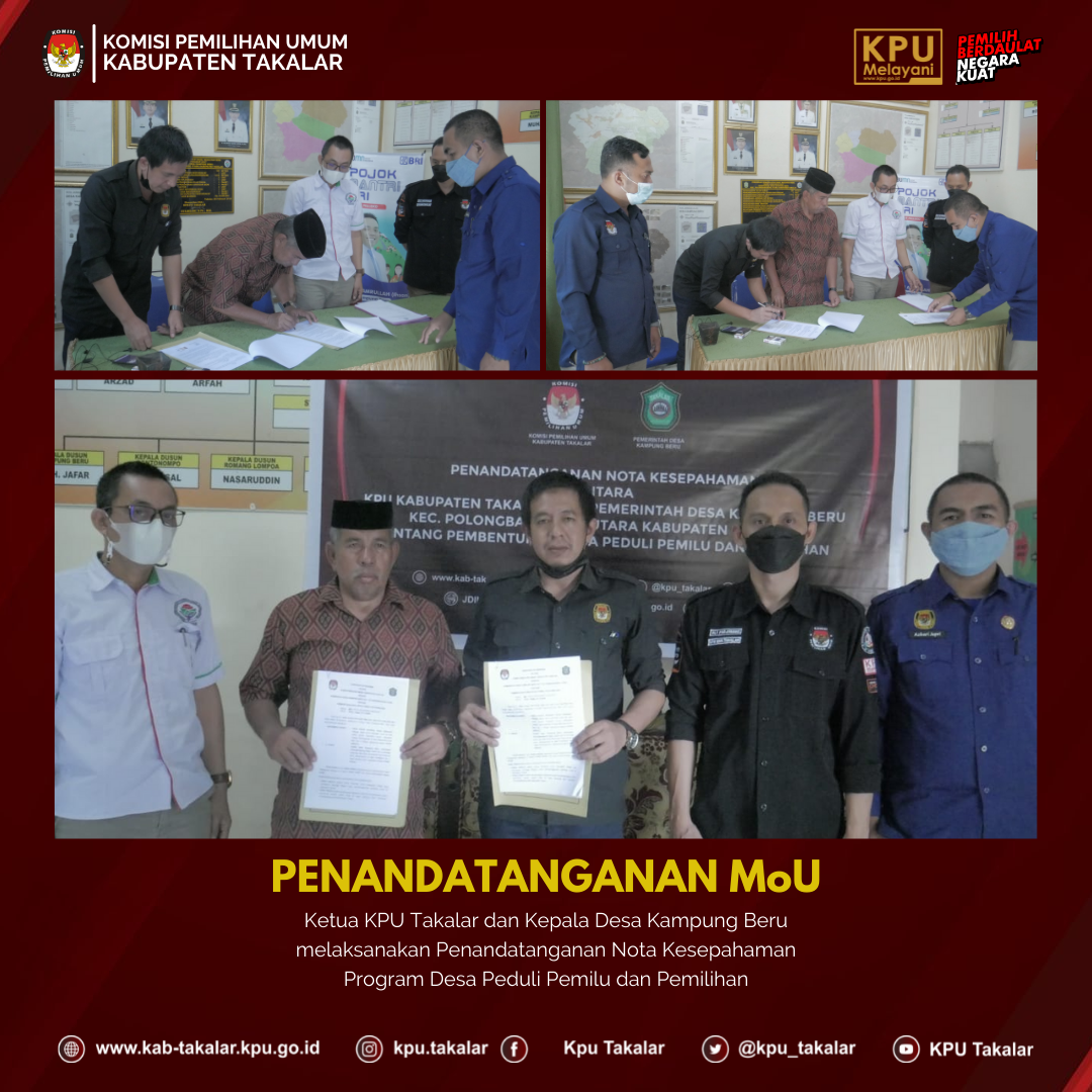 Penandatanganan dilaksanakan di Kantor Desa Kampung Beru oleh Ketua KPU Takalar Muhammad Darwis dan Kepala Desa H. Junaid, disaksikan oleh anggota KPU Divisi Sosialisasi, Pendidikan Pemilih dan Parmas Alimuddin, Kasubbag Divisi Teknis dan Hupmas bersama staf KPU Takalar dan Sekretaris beserta para aparat desa.