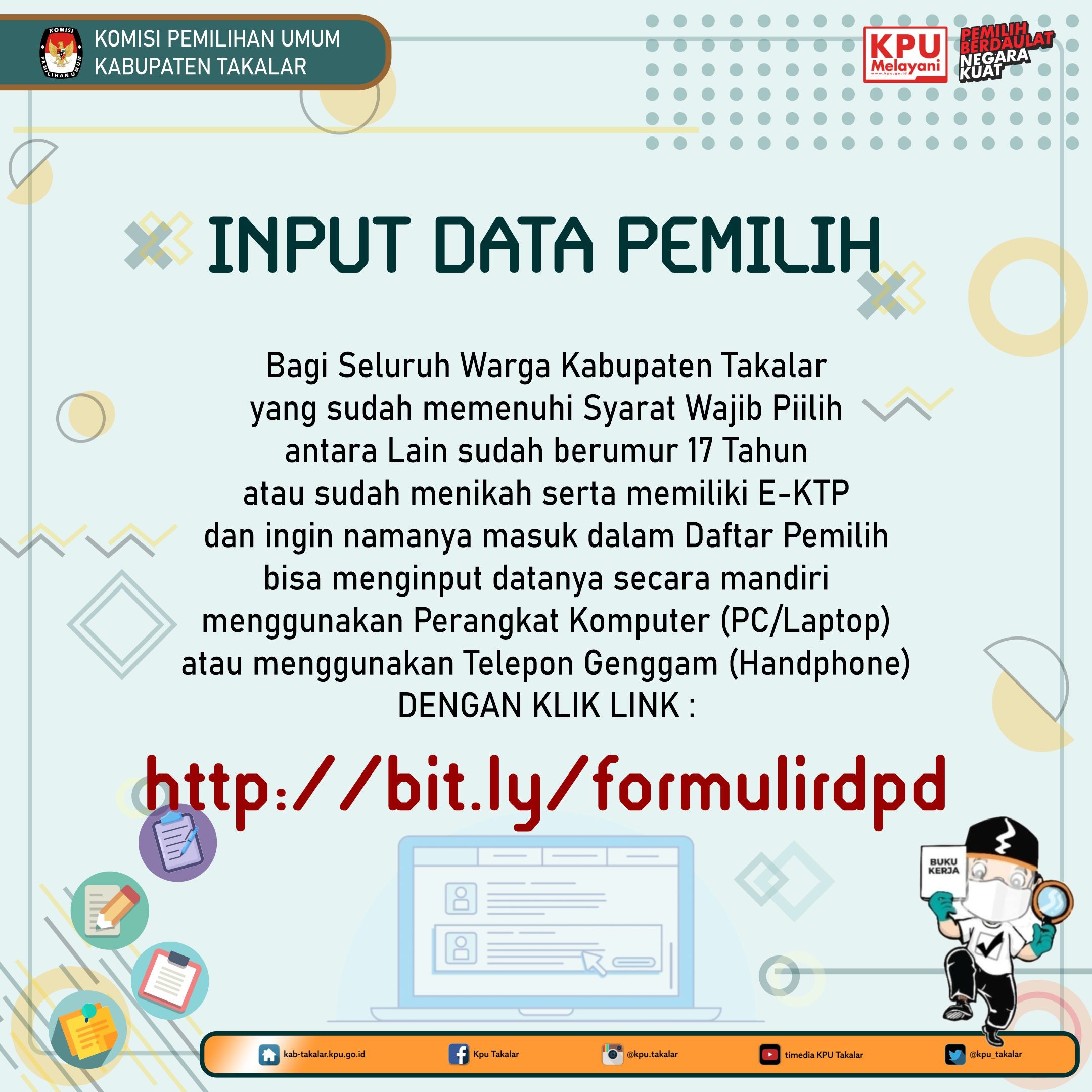 Sehubungan dengan pemutakhiran dan penyusunan daftar pemilih ini, maka KPU Kabupaten Takalar mengajak kepada seluruh warga masyarakat Kabupaten Takalar yang telah memenuhi Syarat Wajib Pilih dan telah memilik E-KTP untuk dapat ikut berpartisipasi aktif dalam kegiatan ini dengan cara menginput data masing-masing secara mandiri yang dapat dilakukan dengan menggunakan perangkat komputer (PC/Laptop) atau melalui Telepon Genggam (Handphone).