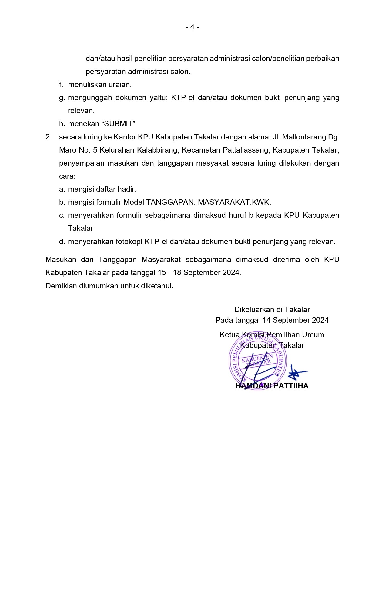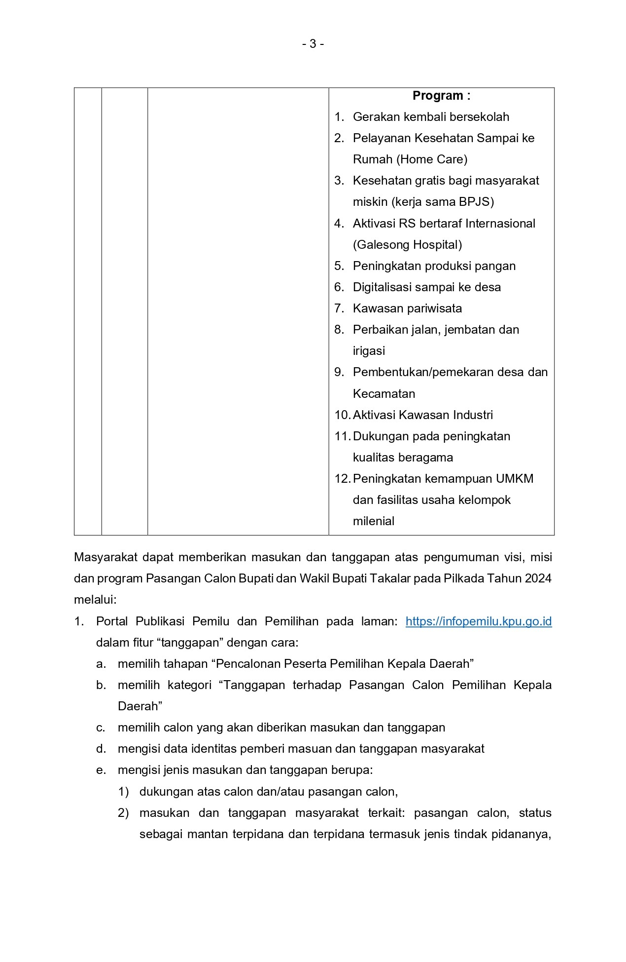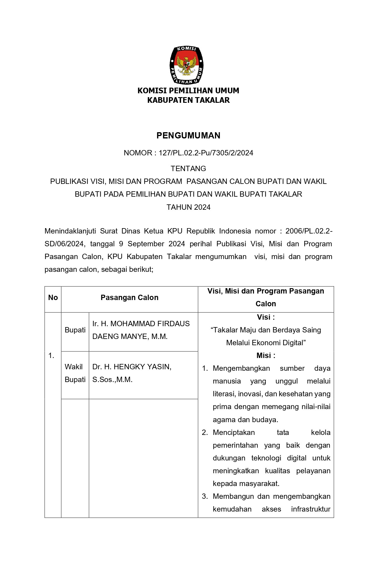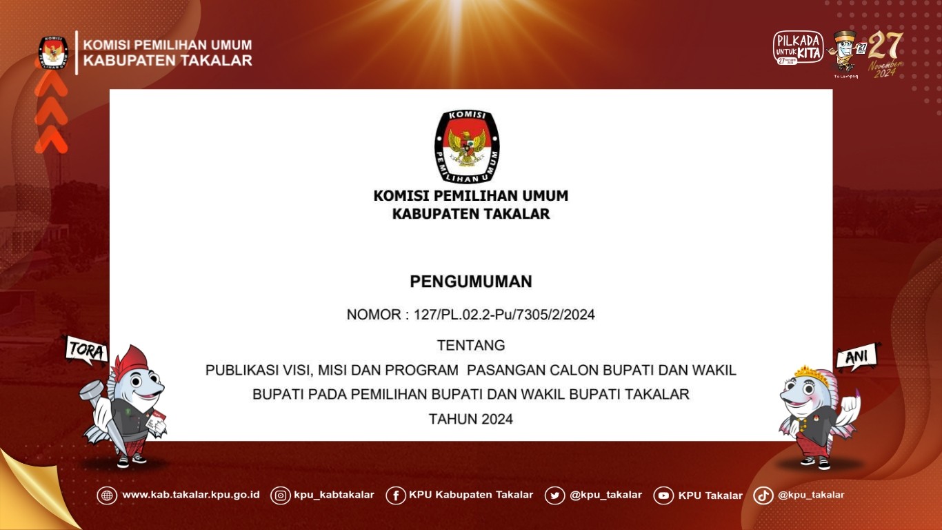 Takalar, kab-takalar.kpu.go.ig, KPU Takalar mengumukan Visi, Misi dan Program Pasangan Calon Bupati dan Wakil Bupati Takalar Tahun 2024, Selanjutnya masyarakat dapat memberikan masukan dan tanggapan atas pengumuman visi, misi dan program Pasangan Calon Bupati dan Wakil Bupati Takalar pada Pilkada Tahun 2024.